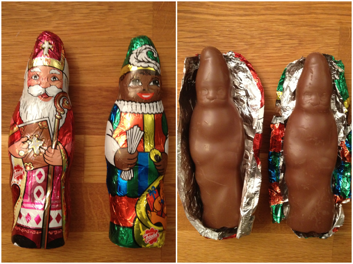 Naar aanleiding van een ingezonden tip: de eerste dubbeltest. Iedereen ziet van een kilometer dat hier iets aan de hand is: vreemd puntmutsje bij de Piet en de ‘houding’ van beide figuurtjes is hetzelfde. Rara. Folie zit daarentegen redelijk ‘ok’ om de figuren heen, bovendien de eerste met duidelijke branding (Friedel). Veilig traditioneel kleurthema op de Piet (maar wel in vier verschillende kleurencombo’s verkrijgbaar, kudos), redelijk geloofwaardige Sint ook. Eens zien hoe breed de genenpoel van deze figuren onderhuids is.